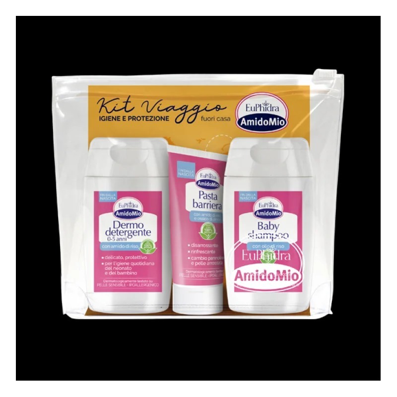 Un pratico e comodo kit viaggio per portare ovunque 3 prodotti essenziali di AmidoMio. Da mettere in borsa, in valigia o nello zaino per viaggi anche in aereo. Proteggi la pelle del neonato e del bambino dappertutto senza compromessi.